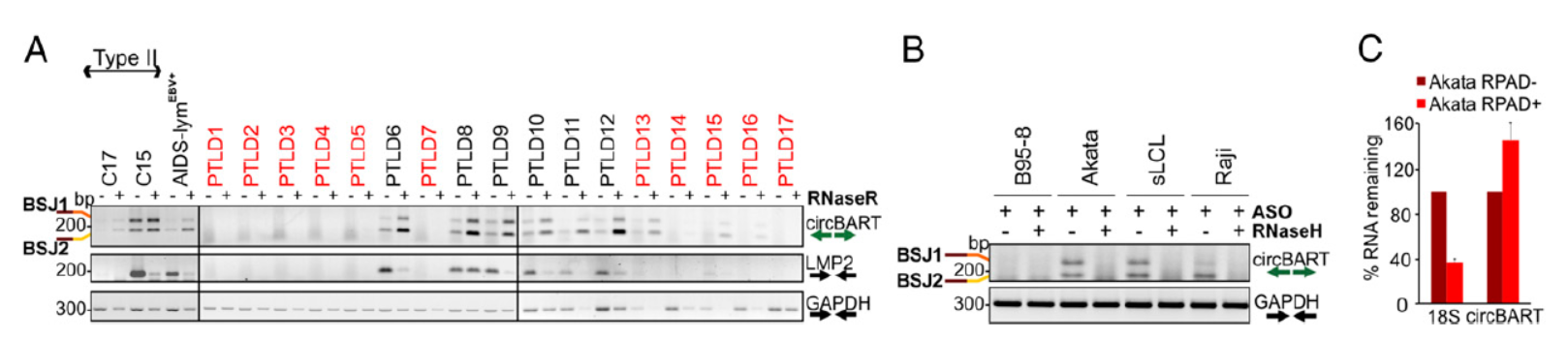 进一步,作者测定了EBV阳性和阴性细胞中,两种circBART分子的含量和表达情况,结果表明在EBV阳性的细胞中均可检测到相应circRNA分子的表达。反义寡核苷酸(ASO)结合RNaseH消化实验(该RNase可以基于DNA互补模板降解对应的RNA分子),进一步证明了circBART分子的存在。