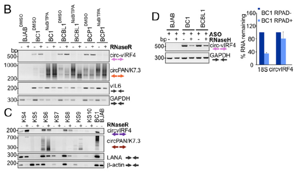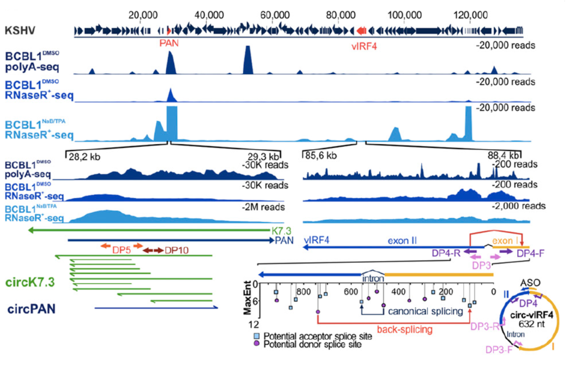 与EBV中circRNA的鉴定思路相似,作者进一步在KSHV阳性的标本中检测是否会有病毒基因组编码基因来源的circRNA分子。在RNase R消化后检测到了在PAN和IRF4基因区存在circRNA产物。PAN基因区的circRNA比较特别,正负两条链的转录产物都有circRNA分子产生,反向拼接的位点也存在高度的多态性,因此该基因区的circRNA产物是成簇出现的(大于100种不同的分子形式)。