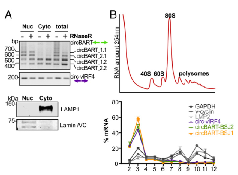 本文报道的故事概括而言,就是报道发现了两种环状DNA基因组的γ-疱疹病毒:EB病毒(EBV)和卡波西肉瘤病毒(KSHV)可以转录产生病毒基因来源的circRNA分子,EBV病毒能够在BART基因区产生仅有外显子组成的circRNA或同时携带外显子和内含子的circRNA分子,前者在胞质和核中均有定位,后者主要定位于核内。KSHV病毒在IRF4和PAN基因区均发现有对应的circRNA生成,它们在胞质和核内均有分布,其中PAN基因来源的circRNA为簇,且正负两条链都有相应的产物。作者还分析了这些circRNA翻译的潜能,从实验数据来看被核糖体捕获的circRNA偏少,这些circRNA更倾向于分布在游离的RNA,但也不能排除这些circRNA可翻译的可能性。