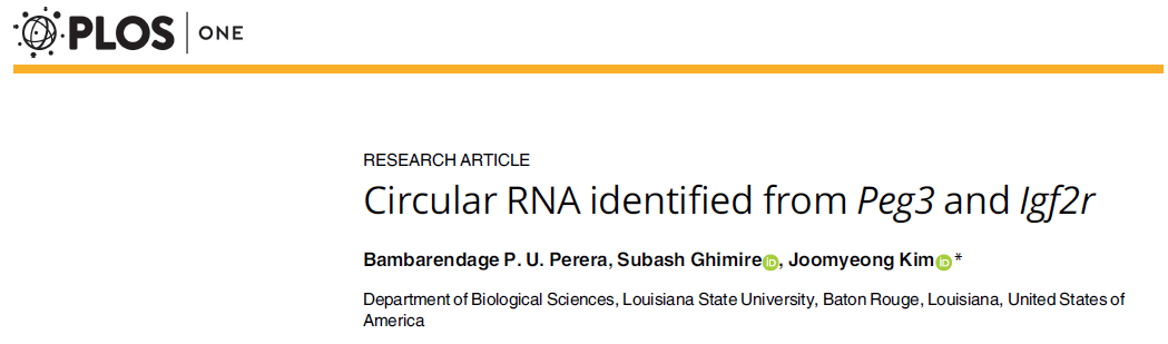 2. Perera BPU, Ghimire S, Kim J. Circular RNA identified from Peg3 and Igf2r. PLoS One. 2018 Sep 14;13(9):e0203850. doi: 10.1371/journal.pone.0203850.