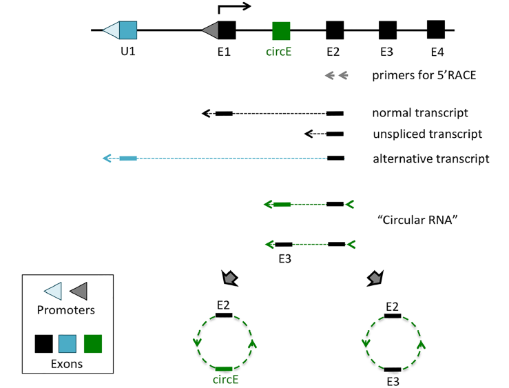 来自美国路易斯安那州立大学的研究人员偶然发现了一个有趣的现象,通过基于5’ RACE实验技术的二代测序方法,发现了两种印迹基因Peg3和Igf2r可以生成环形RNA——circPeg3和circIgf2r。circPeg3大小约为214nt,在新生儿脑部、肺和卵巢中低丰度地表达;相反,circIgf2r由于具有不同外显子的组合,形成不同的变异体,而且在很多类型组织中高丰度地表达。这两种环形RNA的表达模式与其相应mRNA的表达模式完全不同。该研究提示了环形RNAs很有可能参与了印迹基因的功能和表达调控。