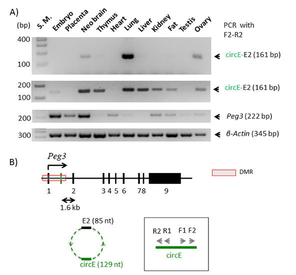 通过对Peg3基因中的circE外显子设计两对反向引物(R1/F1和 R2/F2),通过巢式RT-PCR检测circPeg3表达情况(B)。PCR检测小鼠不同组织中Peg3 mRNA和circPeg3表达情况,发现Peg3 mRNA和circPeg3在组织中的表达模式不一样,两者的表达水平无相关性,Peg3 mRNA主要在胚胎、胎盘和新生儿的脑部中高表达,在其他组织中中等到低等水平地表达。而circPeg3主要在新生儿脑部、肺、卵巢表达,而且在各组织中总体表达水平偏低,这与测序结果reads偏低一致(A)。