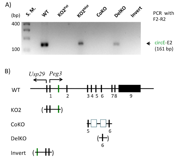 通过对Peg3等位基因的不同位置进行相应的突变,观察circPeg3的表达情况。KO2突变类型,是指删除了包含circE外显子的4kb基因组区域,如果这情况发生在母系遗传等位基因上,则不影响circPeg3的表达;如果这情况发生在父系遗传等位基因上,则circPeg3的表达水平明显受到抑制。CoKo突变是指在5号内含子中插入7kb序列,会缩短Peg3 mRNA的长度, 如果该突变发生在父系遗传等位基因,会明显抑制circPeg3的表达,说明circPeg3的形成需要完整长度的Peg3基因;Invert突变是指4-kb Peg3-DMR序列颠倒,这两种突变也会明显降低circPeg3的表达水平。但是DelKO突变是指删除6号外显子中1kb序列,对circPeg3的表达无明显影响。总之,circPeg3的表达需要circE和Peg3基因的2号外显子,受父系遗传等位基因突变的影响。
