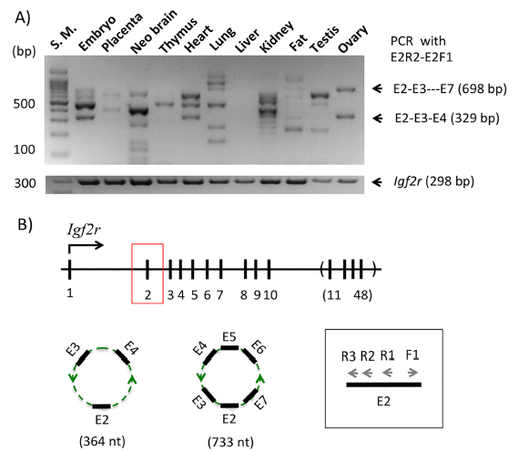 分离小鼠不同组织来源的总RNA后,利用针对印迹基因第二个外显子的特异性引物进行反转录成cDNA(环形RNA从第二个外显子成环的概率大),最后cDNA经G-tailing处理后巢式PCR扩增后进行二代测序。数据分析发现转录产物大多分为三种:含有1号外显子和2号外显子的正常剪接转录本、不剪接的转录本和从上游新的外显子/启动子开始的新转录本。重要的是,还发现了印迹基因可产生不寻常的外显子组合的转录本,即环形RNAs。这些印迹基因主要是Peg3, Dlk1和Igf2r。对于Peg3,和Dlk1,其circRNA会包含来自基因第一内含子的小外显子,其表达丰度很低。circE外显子是只存在环形RNA中,而不存在mRNA。对于Igf2r,可检测到该基因来源的多种形式circRNA,其不同的外显子组合可以从2号到12号外显子,而且在不同组织中的表达丰度很高。
