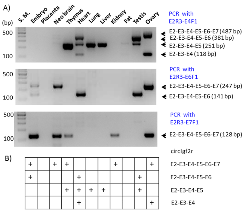 为了验证不同形式的circIgf2r是由不同外显子组合形成的,在2号外显子设计反向引物(E2R3),在4,6,7,10号外显子分别设计前向引物(E4F1, E6F1, E7F1,E10F1),PCR结果显示除了E2R3- E10F1一对引物扩增不出来产物之外,其他三对均可以扩增出来,而且在不同组织中发现了不同形式的circIgf2r表达(A,B),其中E2-E3-E4组合形式的circIgf2r主要表达在心、卵巢,E2-E3-E4-E5-E6-E7组合形式的circIgf2r主要表达在胚胎、新生儿脑部、胸腺、肾和卵巢。二代测序没挖掘到的E2-E3-E4-E5组合形式的circIgf2r也在一些组织中表达。E2-E3-E4-E5组合和E2-E3-E4-E5-E6-E7组合的circIgf2r在组织中出现的频率较多,会更容易检测到(B)。在15个小鼠中有10个小鼠能重复出相同的结果。这些结果提示了circIgf2r通过组合不同的外显子形成不同形式的circIgf2r。