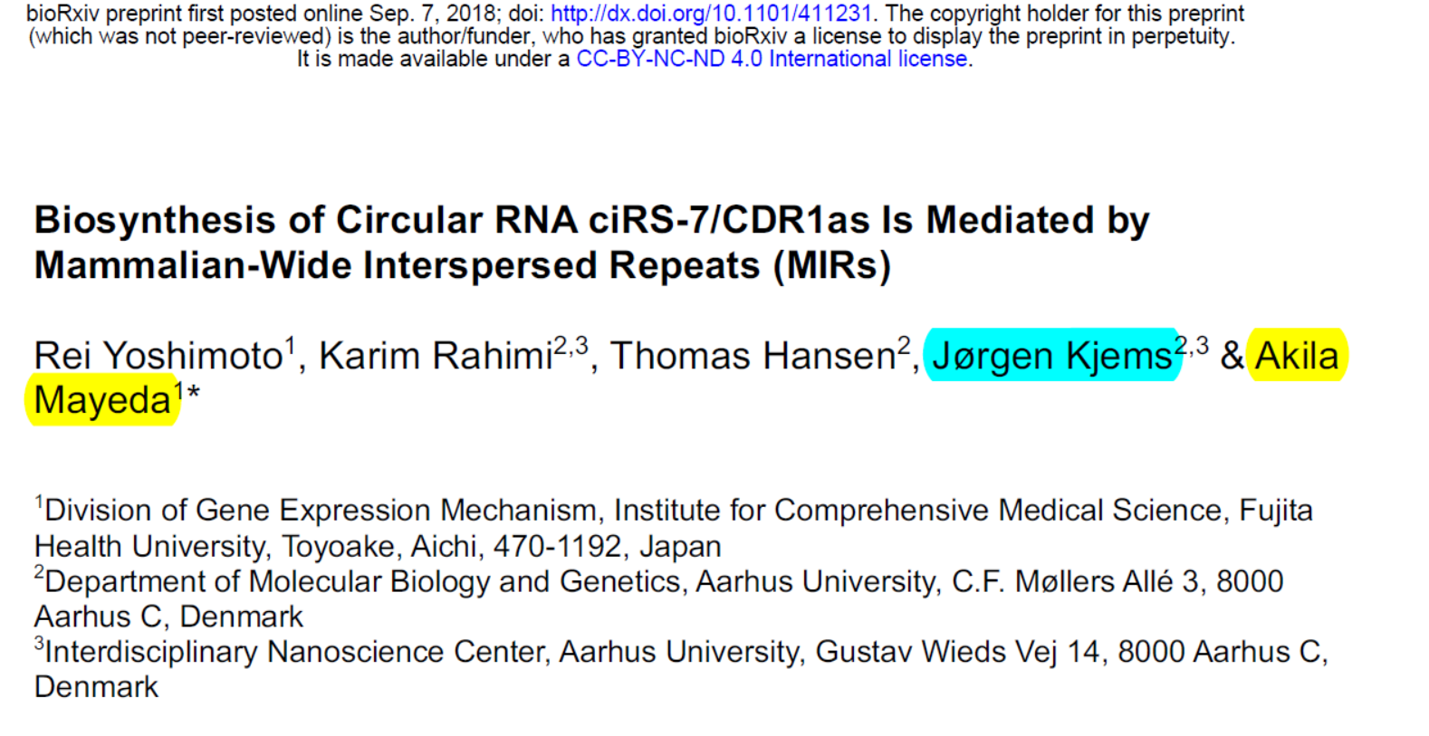 环状RNA研究越来越受到国内外研究学者的青睐,有关环状RNA的一些基本科学问题也不断取得新的认知。近日,知名预印本杂志BioRxiv发表了一项最新的circRNA研究进展,报道发现一种新的CDR1as的生成机制,由哺乳动物的散在重复元件(Mammalian-Wide Interspersed Repeats,MIR)介导[1]。文章的通讯作者是日本藤田健康大学的Akila Mayeda,著名circRNA研究专家Jørgen Kjems也是本文的共同作者。
