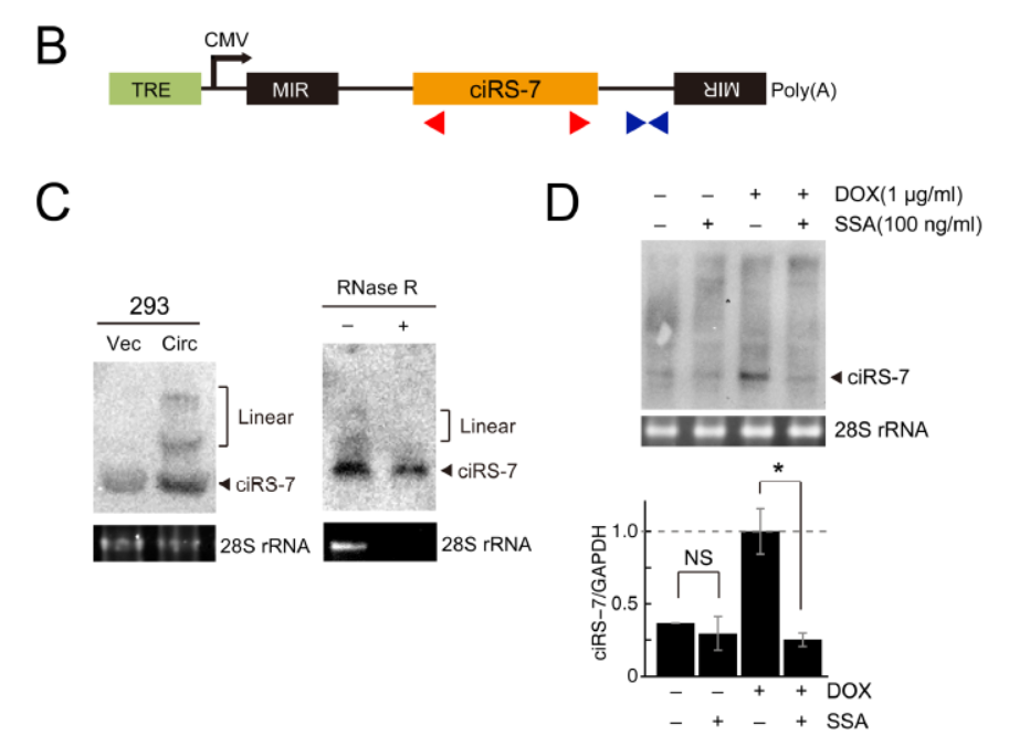 基于上述发现,作者构建了模拟CDR1as生成的mini基因载体,该载体基于四环素诱导系统,当添加强力霉素(Dox,一种四环素的类似物,广泛用于Tet诱导体系)后,可诱导下游序列的转录表达。前体mRNA剪切抑制剂Spliceostatin A用于抑制转录后RNA的剪切作用。通过Northern杂交,作者验证了这一载体系统的有效性。