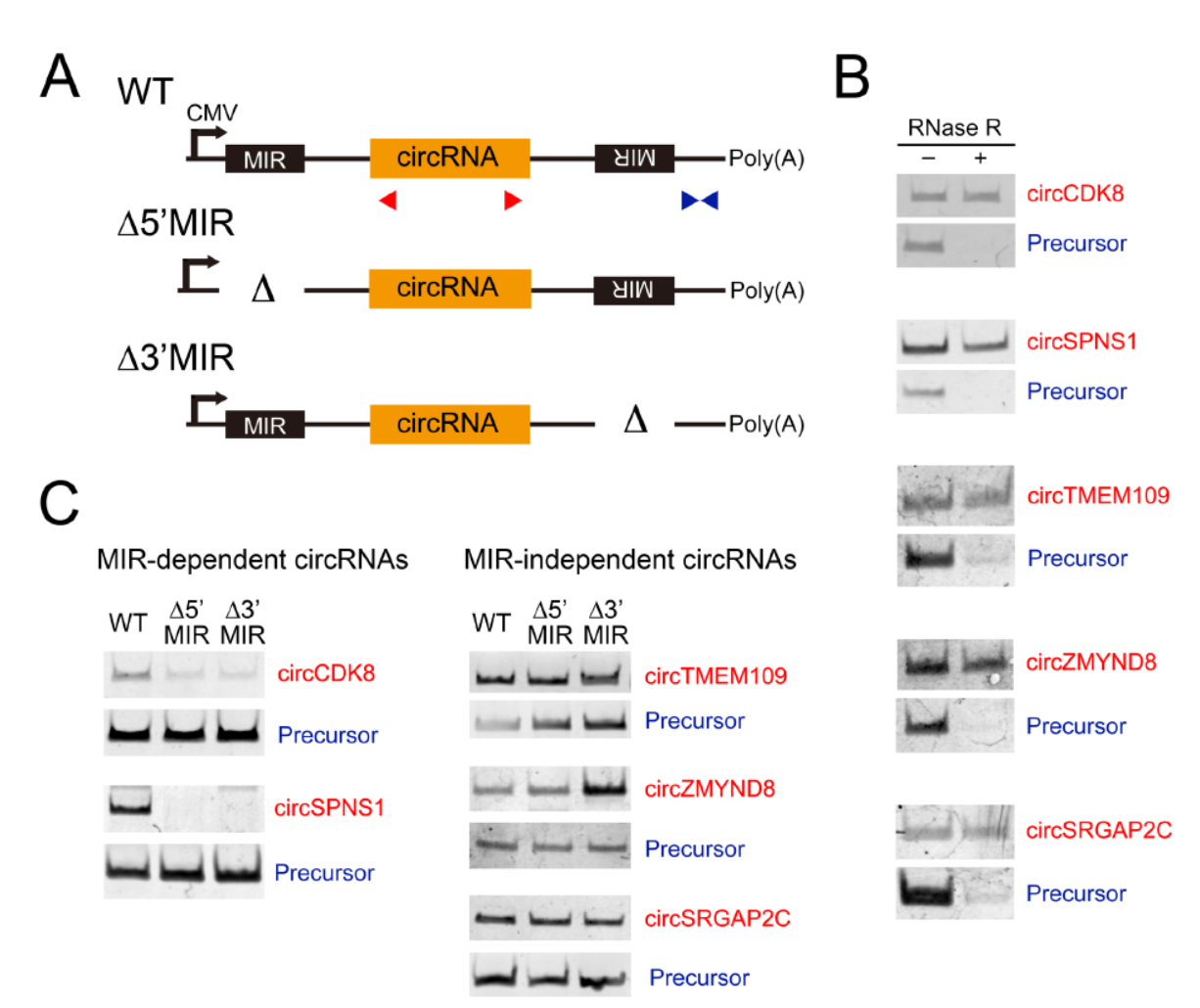 在hg19基因组序列中,作者共分析到595094种MIR元件,与小鼠mm9基因组分析的结果比对后,104074种MIR是保守的。进一步,作者发现了有171种circRNA的上下游1000bp范围内同时存在反向互补MIR元件。这些circRNA中有一些circRNA的两侧序列非常长,难以构建报告载体验证,作者挑选了5种circrNA进行了mini基因载体的构建和验证:circCDK8, circSPNS1, circTMEM109, circZYMND8和circSRGAP2C。验证结果表明删除这些circRNA的上下游反向互补MIR可显著影响它们的生成效率。
