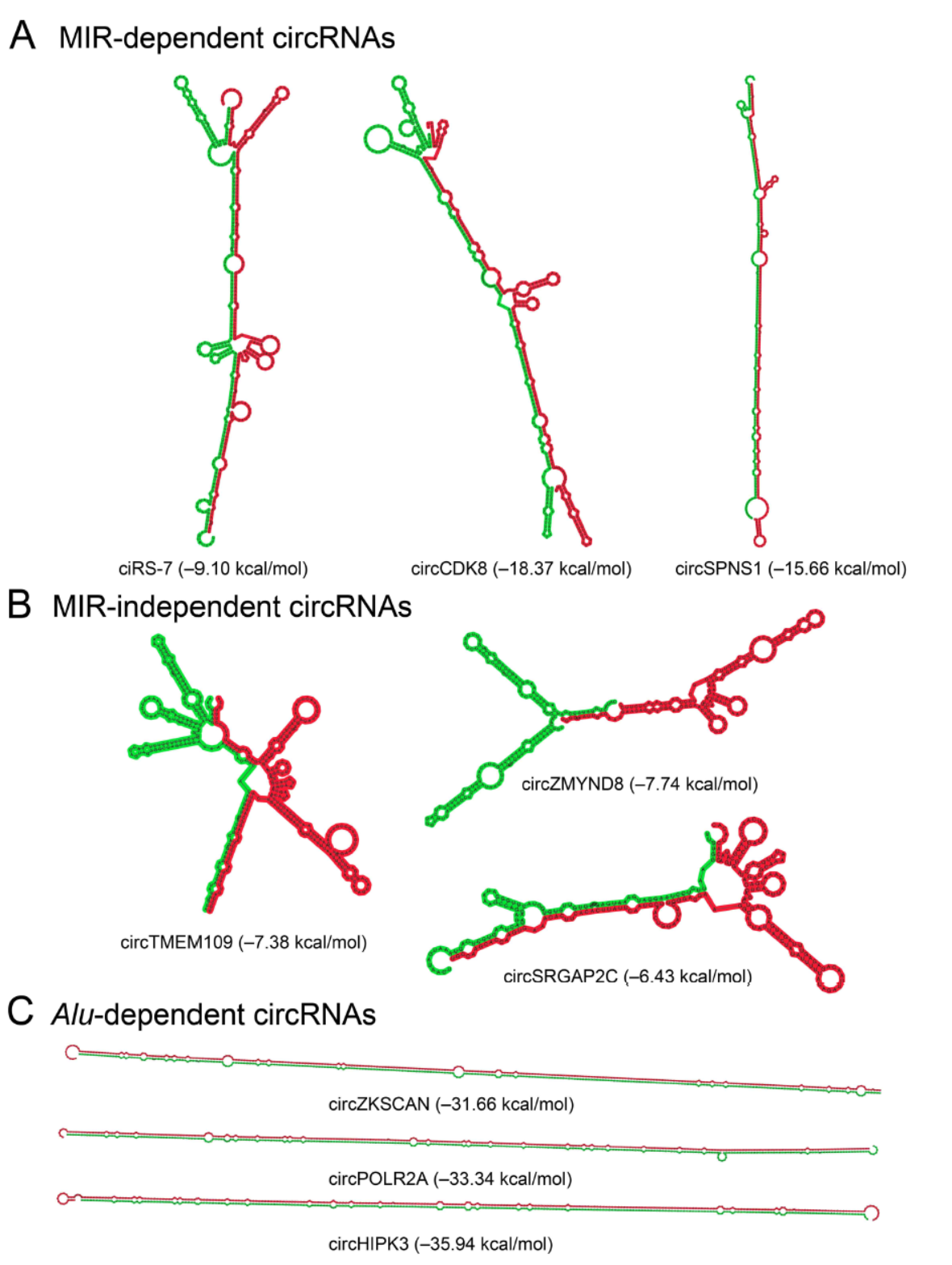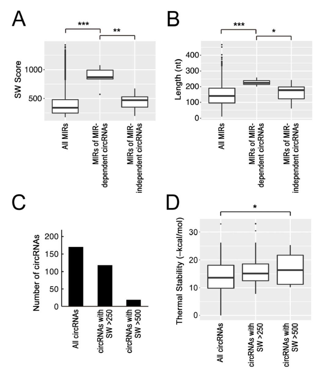 MIR在进化中比Alu元件更古老,很多MIR元件因此变得短了。如果是这样的,那么在不是MIR依赖生成的circRNA两侧的MIR元件势必没有依赖MIR生成的circRNA两侧的MIR元件保守性好。为验证这一假设,作者分析了MIR依赖和不依赖的circRNA两侧序列中MIR元件的Smith-Waterman值,结果确实证明MIR依赖的circRNA两侧SW值明显高,且MIR元件的长度也更高,更完整。在所发现的171种circRNA中,SW值大于250的有118种,SW值大于500的有19种,随着SW值的增加,对应的circRNA两侧的MIR元件的热力学稳定性也越高。