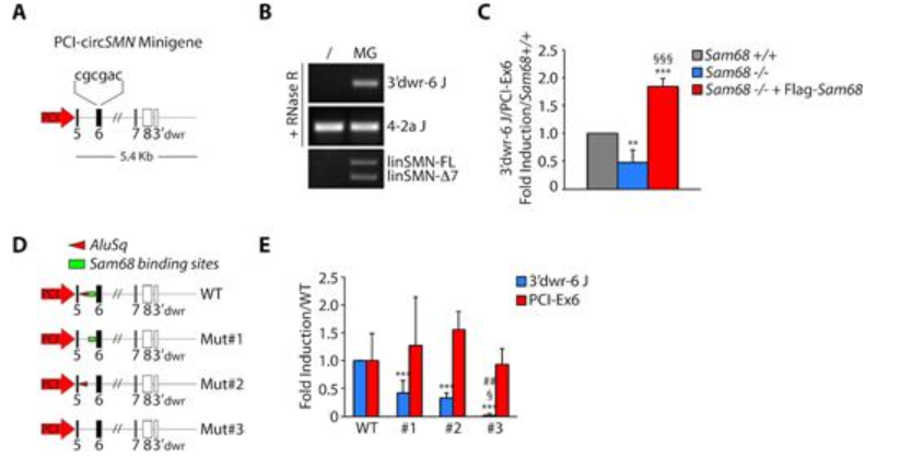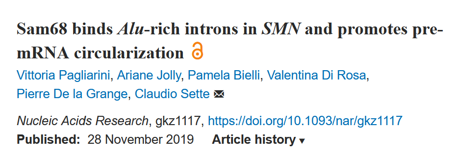 Pagliarini, V., Jolly, A., Bielli, P., Di Rosa, V., De la Grange, P., & Sette, C. (2019). Sam68 binds Alu-rich introns in SMN and promotes pre-mRNA circularization. Nucleic acids research.