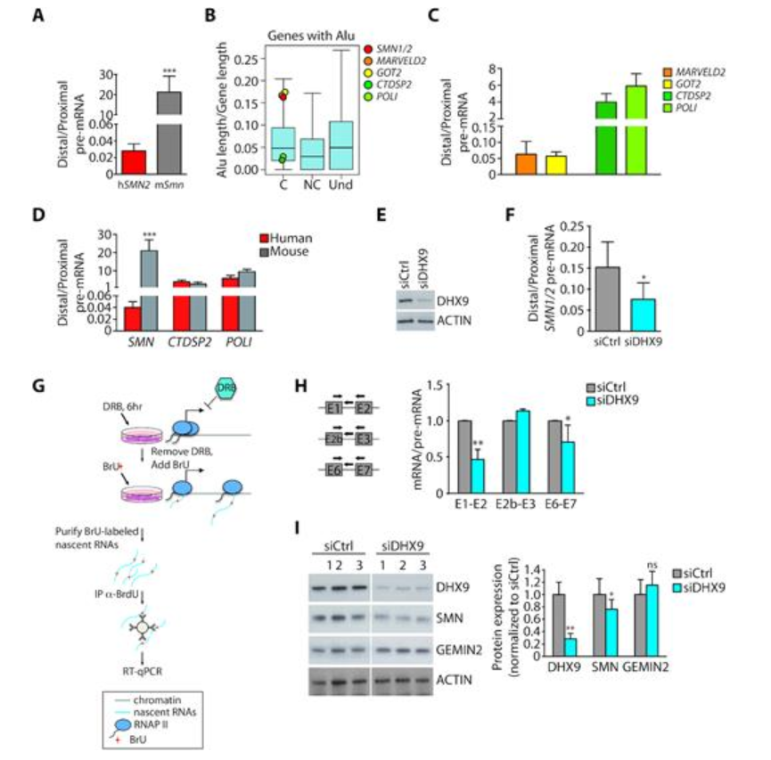 该研究首先发现SMN基因中存在大量的Alus元件,其中有很多以反向排列,形成反向互补序列。进一步,作者通过沉默细胞中RNA解旋酶DHX9,增加SMN mRNA前体反向互补配对的几率,发现这些反向互补序列的配对负调控SMN基因的转录进程。