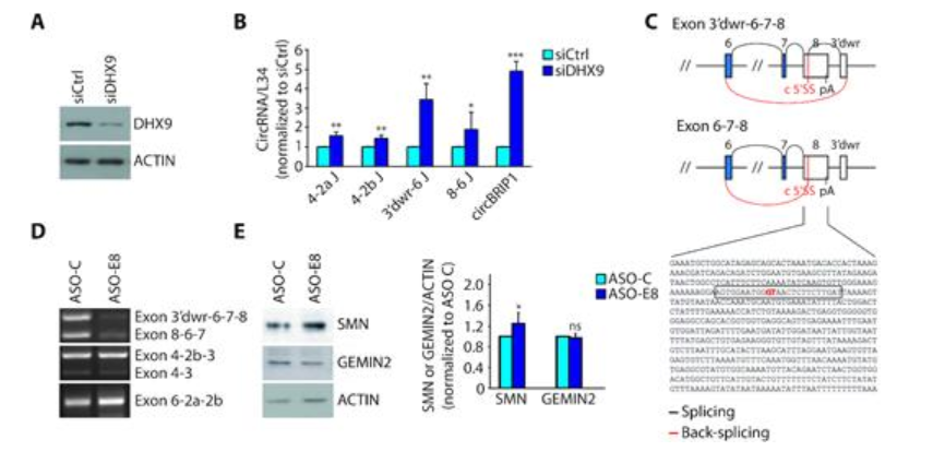 接下来,研究发现,干扰DHX9后,起源于SMN基因的circRNAs生物发生减少,SMN蛋白丰度增加,所以推测减少SMN 来源circRNAs的生成是否可以恢复SMN蛋白的含量。为了检测这一假设,该研究使用ASO(an antisense oligonucleotide),干扰了由SMN外显子8内隐性剪切位点形成的circRNA的形成,结果发现在细胞中转染ASO后,SMN前体mRNA的转录没有发生变化,但SMN蛋白的丰度明显地增加了20%,表明cicrRNA与基因座的蛋白质编码进行潜在的竞争。