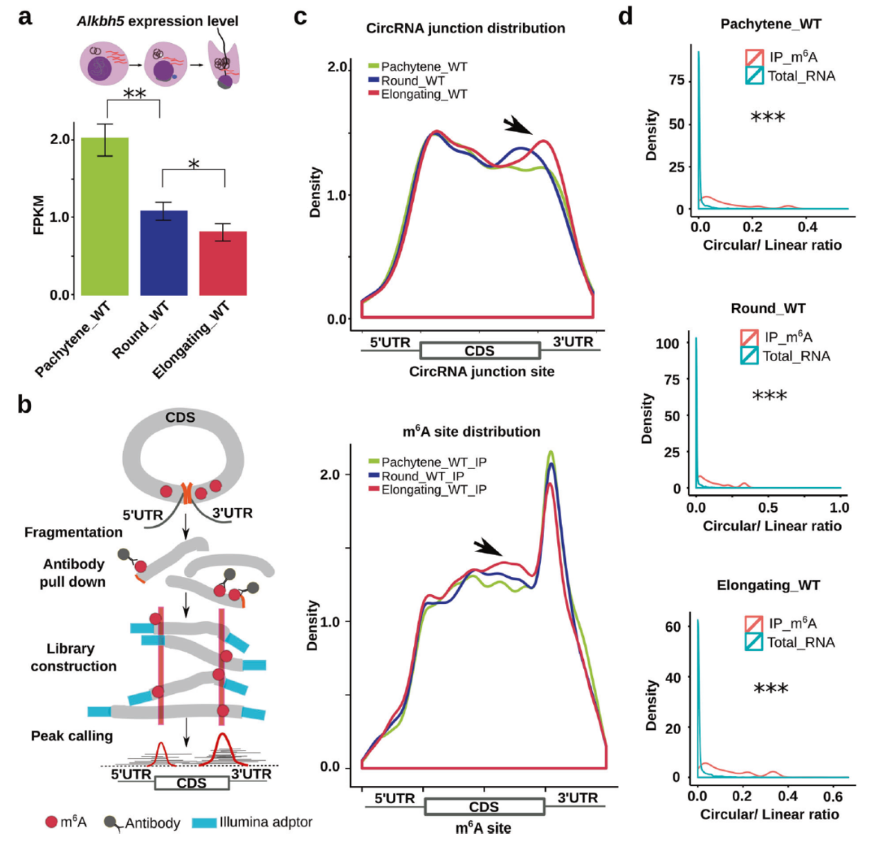 作者发现随着精子发生过程进展,Alkbh5基因表达下调,Alkbh5基因敲除小鼠中精子发生过程从粗线期,圆形细胞期到精子延长阶段的circRNA表达会大幅增高。Anti-m6A RIP-seq测序分析表明,随着精子发生的进展,circRNA拼接位点处的m6A修饰呈现增加趋势。