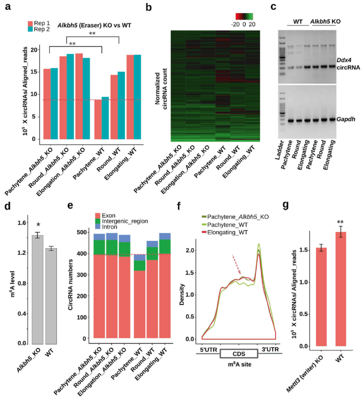 Alkbh5敲除小鼠中,粗线期,圆形细胞期和精子延伸期的细胞中circRNA的丰度一直很高,但野生型小鼠中circRNA的丰度是伴随着精子发生过程逐步增高的。Alkbh5敲除小鼠中,相关circRNA的m6A水平显著高于野生型。而Mettl3敲除的小鼠中则呈现相反的趋势。