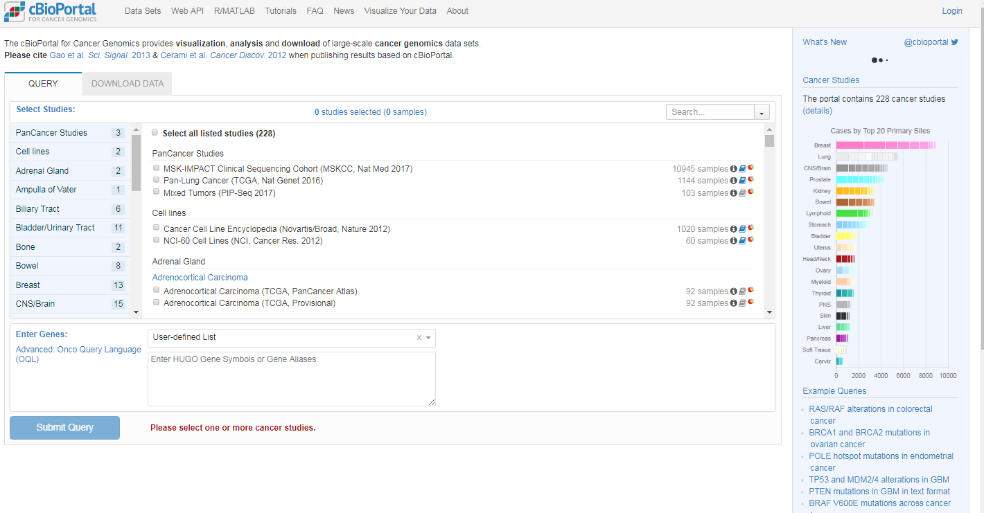- 首先登陆cBioPortal for Cancer Genomics官方网站http://www.cbioportal.org/,界面如下;