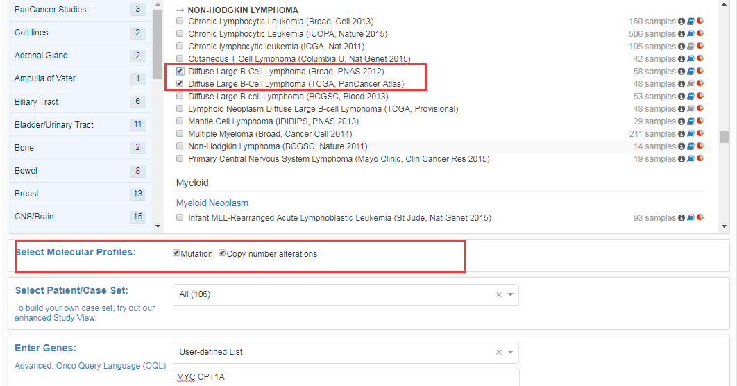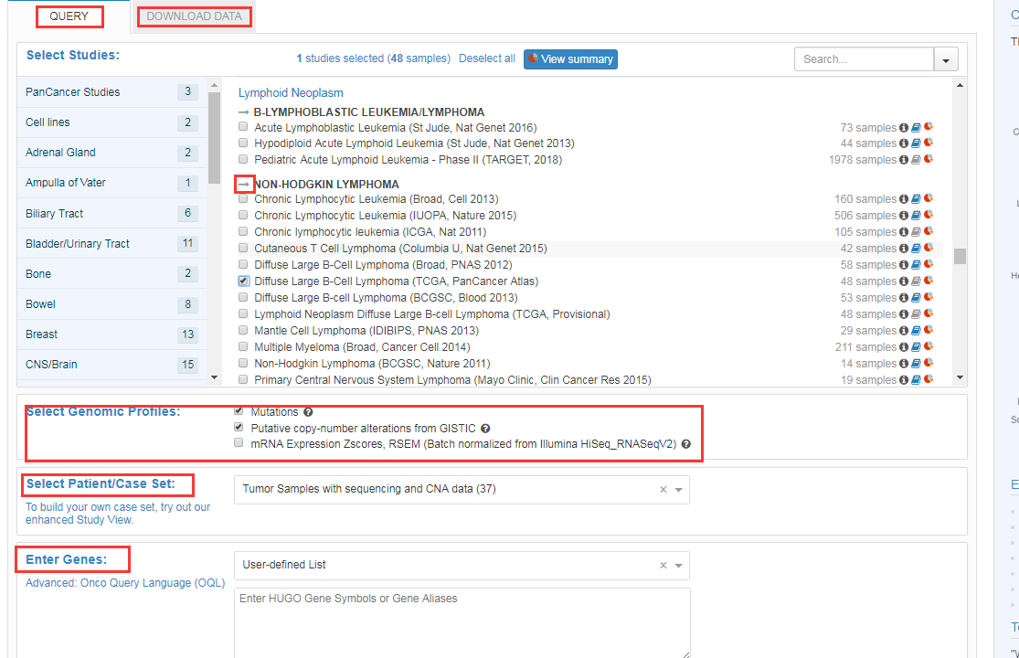 - 现以弥漫性大B淋巴瘤为例进行检索,界面的左上角有查询界面和数据下载两大功能,首先选择好研究肿瘤的类型,向右箭头可以对该项目进行全选,勾选不同的数据库会出现不同的“Genomic Profiles”,其中的mRNA表达谱尤为重要,记得勾选,后续可以进行多项分析和预后相关预测。另外“Patient/Case Set”根据需要选择,最后输入你想研究的基因;