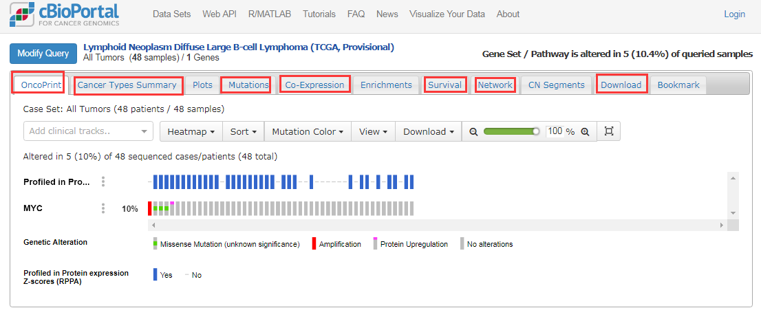 - 查询结果如下,myc基因在DLBCL肿瘤病人中的基因改变类型的比例情况;