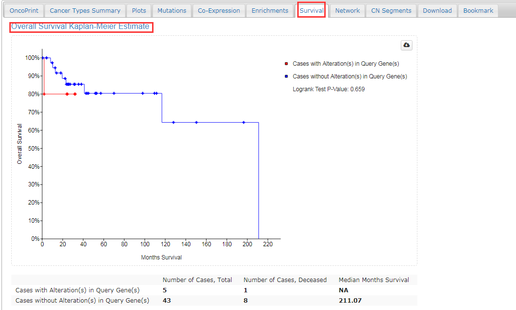 - 点开“Survival”,可查看myc基因是否发生突变与病人的OS、DFS的相关性,这个对于研究基因的临床相关性和临床应用有重要的作用;