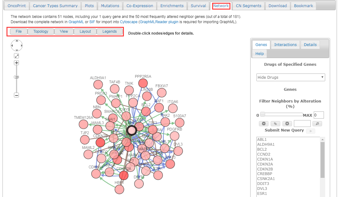 9.点开“network”,可查看myc基因与该肿瘤中最频繁发生改变的50个基因的调控网络关系;