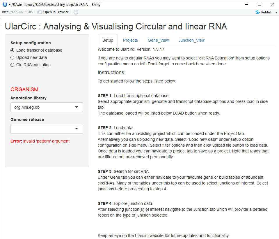 安装完 Ularcirc 之后,我尝试了一下作者提供的内置文件,然而不知道为何无法加载基因组注释信息,后面的功能似乎也无法进一步体验。