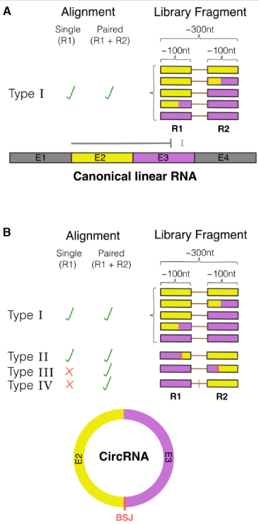 A / B 分别展示了序列比对可能的结果,A 图为线性 RNA 的比对结果可能情况,而 B 图为 circRNA 的。而我们所检测的 BSJ 实际就是图 B 的 Type II / III,作为 circRNA 分子的候选。