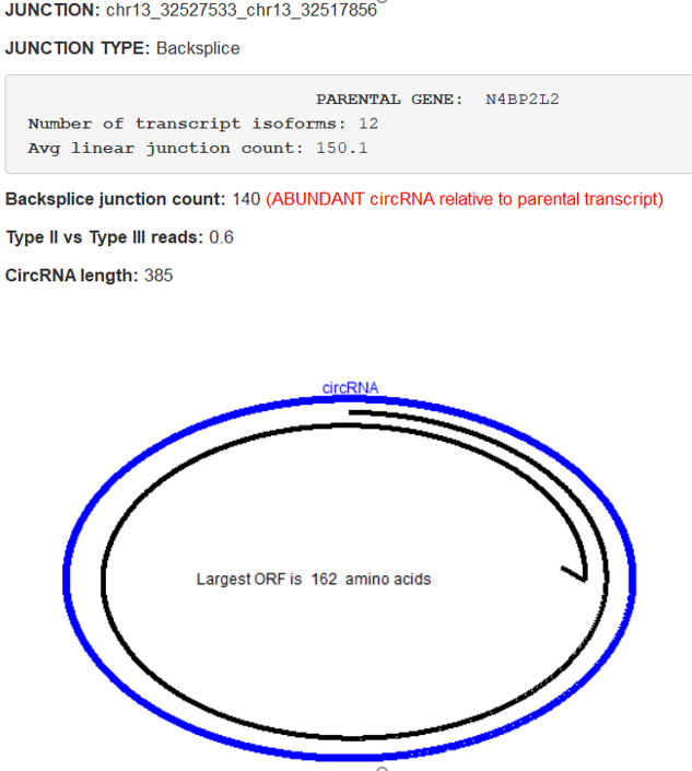 从图中我们可以获得很多 circRNA 的信息,并且能够观察到该 circRNA 的 ORF 的长度是要大于 circRNA 本身的长度。