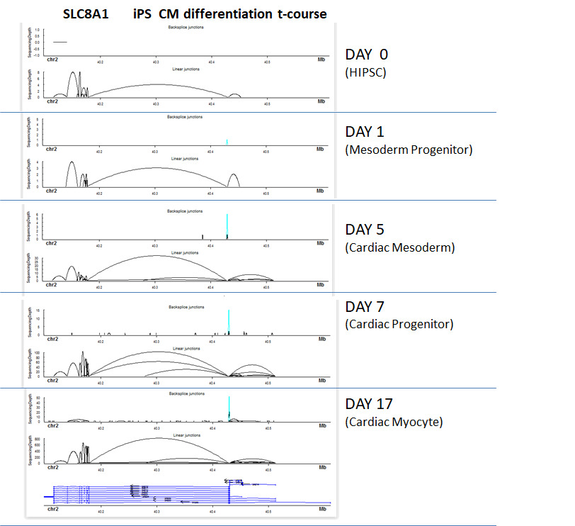 图中展示了 SLC8A1 这个基因在心肌细胞分化过程中 BSJ 以及 FSJ 的表达模式,每幅图上面表示 BSJ,下面表示 FSJ;其中连线表示 splicing junction,而连线的高低表示表达丰度的高低。这里的 BSJ 被用蓝色高亮了。