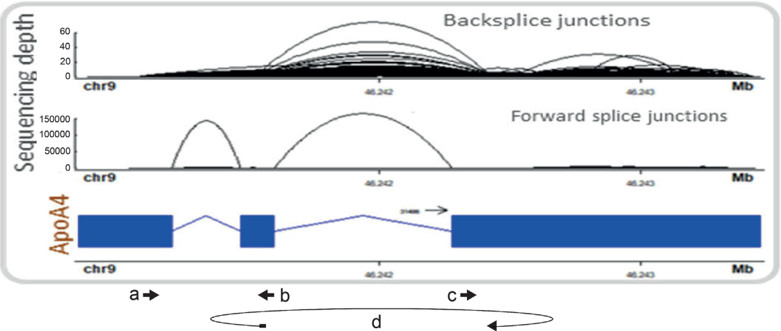 我们可以看到,ApoA4 的 circRNA 的 BSJ 起始与终止位点落在了第二和第三个外显子的内部而不是经典的剪切位点处。