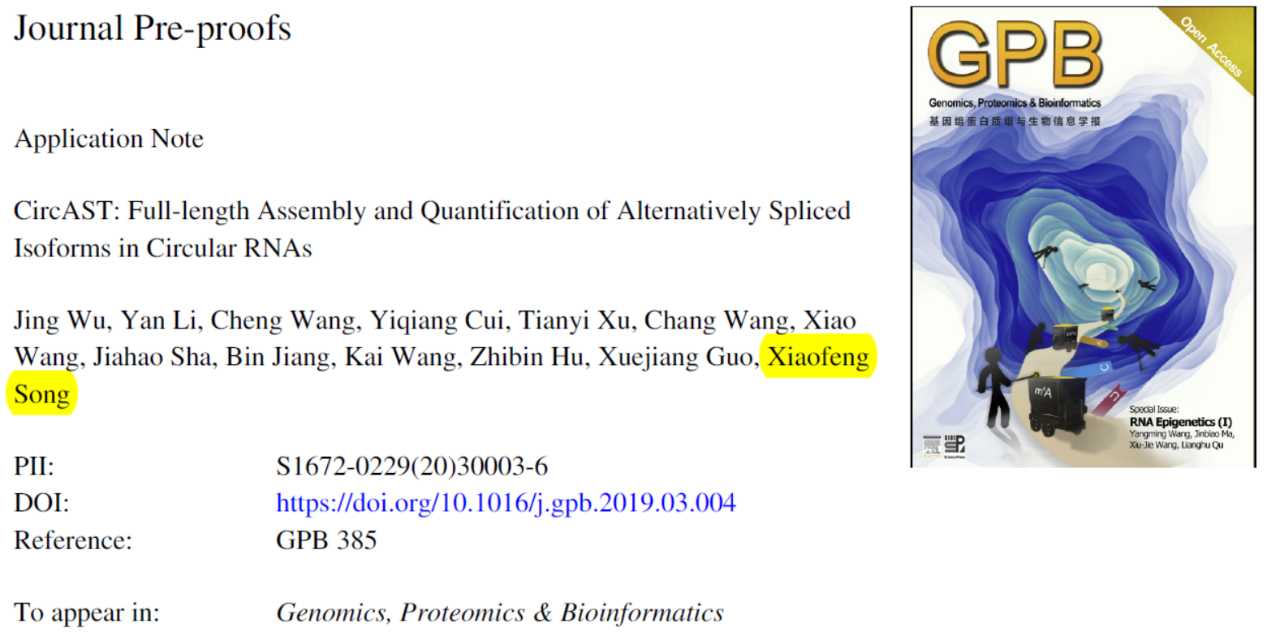 1. Wu, J., et al., CircAST: Full-length Assembly and Quantification of Alternatively Spliced Isoforms in Circular RNAs. Genomics Proteomics Bioinformatics, 2020.