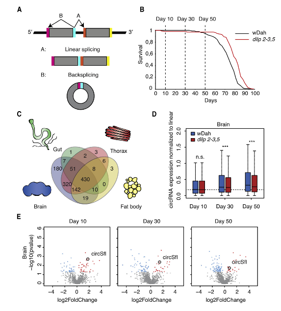 在各种生物体中,circRNA都会随着年龄的增长而累积,但是circRNA在衰老中的作用还尚不知晓。为了探索circRNA表达随年龄的动态变化,作者对野生型(WDah)果蝇和长寿的三个胰岛素样多肽(dilp 2-3,5)突变果蝇进行全转录水平的深度测序。作者解剖了幼龄(出生后第10天)、中年(出生后第30天)和老年(出生后第50天)果蝇的四个主要成虫组织(脑、有马氏管的肠管、胸部和脂肪体),以组织特异性的方式研究其衰老过程。结果表明,circRNA表达在果蝇大脑中有很明显的倾向,大多数circRNA是大脑所特有的,在其它组织中不表达,这与之前的报道结果相一致。
