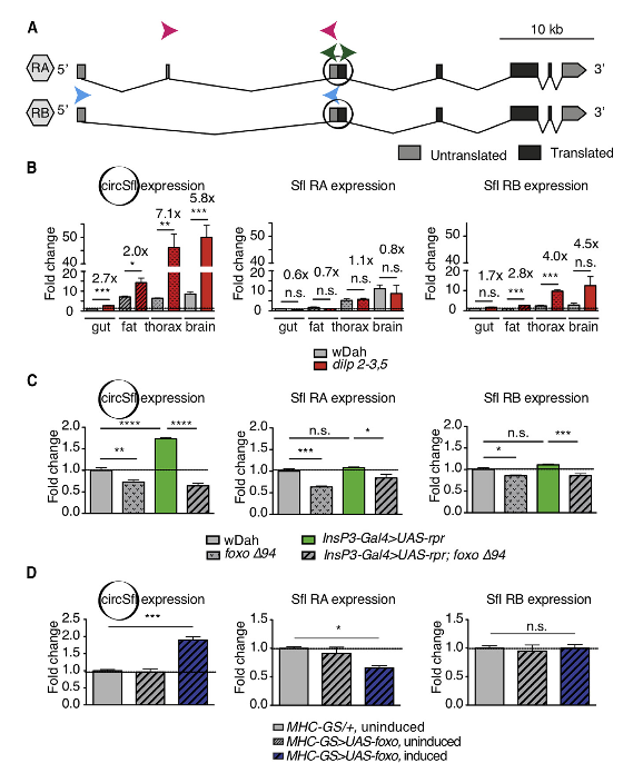 为了验证RNA测序结果,作者使用特异性引物通过qRT-PCR来分析circSfl和源于Sfl基因的两个不同线性转录本(RA和RB)的表达水平,RA和RB的不同之处在于RA基因的5’非翻译区(UTR)有一个37bp长的功能未知的外显子。结果表明,在dilp 2-3、5突变果蝇的所有组织和时间点中,circSfl的表达均被上调。有趣的是,Sfl RB的表达,而不是RA,与dilp 2-3、5突变果蝇中的circSfl表达模式相关,暗示线性和环状同系物的剪接之间可能存在联系。与之一致的是,circSfl在其它长寿胰岛素突变果蝇中也同样上调:遗传性切除正中神经分泌细胞(MNC),MNC可以产生胰岛素;在肌肉中过表达dFoxo。在这两种情况下,circSfl的表达均被上调,而非线性转录本Sfl RA和RB。有趣的是,MNC切除果蝇中circSfl的上调也取决于dFoxo,它是MNC切除果蝇延长寿命所需的胰岛素信号传递的下游转录因子。在野生型和MNC切除果蝇中,敲低dFoxo均会下调circSfl的表达。值得注意的是,在饲喂可延长寿命的雷帕霉素果蝇中circSfl表达并没有增加,在饮食限制下的果蝇甚至在mth1突变果蝇中circSfl表达也仅仅是轻微下调。这些结果表明,circSfl在长寿胰岛素突变果蝇中特异性地上调,而这种上调取决于转录因子dFoxo,它是减少胰岛素信号传递以延长寿命所必需的。