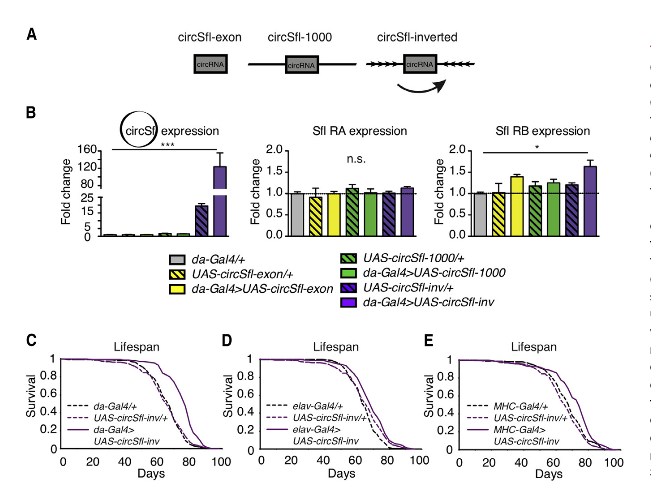 下一步,作者的目标是构建circSfl的过表达突变体。作者测试三种不同构建体的circSfl过表达能力:circSfl-exon(仅含有产生circSfl的外显子)、circSfl-1,000(circSfl外显子加上两侧1,000 bp的内含子)和circSfl-inverted(circSfl-inv;合成circSfl外显子上游1000 bp内含子的反向互补序列,并人工的添加到circSfl外显子下游),仅仅只有circSfl-inv构建体可以显著过表达circSfl,而Sfl RA和RB的表达水平并没有受到很大影响,以下将circSfl-inv称为circSfl过表达突变体。为了验证这种过表达系统是否也适用于其它circRNA,作者为circBtsz合成了类似的过表达构建体。与circSfl的结果一致,circBtsz-inv突变体同样强烈过表达circBtsz,而circBtsz-exon和circBtsz-1000均不影响circBtsz的表达水平。总之,作者利用工程性反向互补的侧翼内含子,来在果蝇体内强烈过表达特异性的circRNA。
