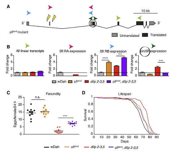 Sfl∆ex2突变体可用作circSfl敲低,因为在这些突变体中circSfl的表达有所降低。因此,作者表征了Sfl∆ex2突变果蝇以及Sfl∆ex2和dilp 2-3,5双突变果蝇,以测试Sfl∆ex2和dilp 2-3,5之间的遗传上位性。有趣的是,虽然Sfl∆ex2单突变果蝇显示出正常的产卵行为,但在Sfl∆ex2和dilp 2-3,5双突变果蝇中,dilp 2-3,5介导的产卵减少得以部分恢复。同样,较小的dilp 2-3,5突变果蝇部分被Sfl∆ex2和dilp 2-3,5双突变恢复,这表明dilp 2-3,5突变果蝇的繁殖力和大小表型部分取决于Sfl RA和circSfl。相反,Sfl∆ex2突变果蝇发育延迟,与dilp 2-3,5突变果蝇相比,Sfl∆ex2和dilp 2-3,5双突变果蝇的发育时间更长,表明发育延缓是受独立的机制调控。最后,Sfl∆ex2和dilp 2-3,5双突变果蝇的寿命显著降低,相比于dilp 2-3,5突变果蝇。总之,作者证明了果蝇的减小大小、降低功能性和延长寿命,而不是延迟dilp 2-3,5突变果蝇发育,取决于Sfl RA和circSfl。