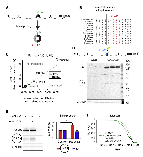 作者试图推测circSfl蛋白可能在胰岛素介导的寿命延长中起作用。蛋白印记实验显示,circSfl蛋白水平确实在dilp 2-3,5突变果蝇中上调。最后,为了确定circSfl编码的蛋白是否足以延长果蝇寿命,作者构建了一个从线性转录本中过表达circSfl ORF的转基因果蝇系。值得注意的是,线性circSfl ORF的普遍表达显着延长了雌蝇寿命。因此,多条证据表明circSfl可以编码蛋白,并且该蛋白足以延长果蝇寿命。