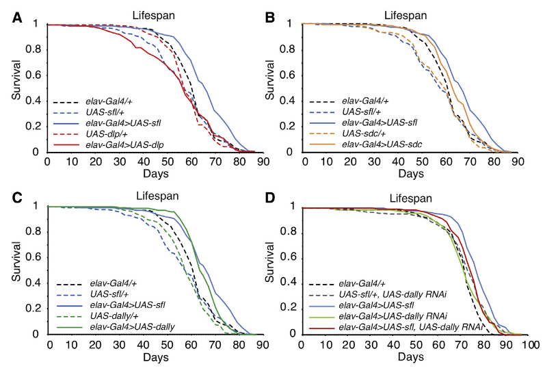 Sfl可以介导硫酸乙酰肝素的合成,果蝇中存在四种Sfl靶向的硫酸乙酰肝素蛋白聚糖:Dally、Dally-like(Dlp)、Syndecan(Sdc)和Perlecan。为了验证Sfl是否通过硫酸乙酰肝素蛋白聚糖来延长寿命,作者在神经元中过表达Dally、Dlp和Sdc。令人惊讶的是,只有过表达Dally对寿命的影响与过表达Sfl对寿命的延长趋势相一致,表明Dally可能是过表达Sfl延长寿命的下游靶标。为了进一步验证,作者进行遗传上位实验,并使用RNAi技术来敲低过表达Sfl果蝇中的Dally。结果表明,敲低Dally废除了Sfl诱导的寿命延长,这表明Dally是Sfl调节寿命的重要的下游靶标。总之,本研究表明在胰岛素突变果蝇中circSfl和Sfl的线性剪接被改变,并且过表达circSfl或Sfl可以以组织特异性的方式延长寿命。
