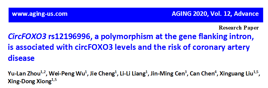 2020年7月2日,广东医科大学的熊兴东教授在Aging (Albany NY)(IF=4.831)杂志上发表了一篇题为“CircFOXO3 rs12196996, apolymorphism at the gene flanking intron, is associated with circFOXO3 levels and the risk of coronary artery disease”的文章,阐述circFOXO3基因侧翼内含子的rs12196996多态性与circFOXO3表达和冠状动脉疾病风险之间的相关性([1])。