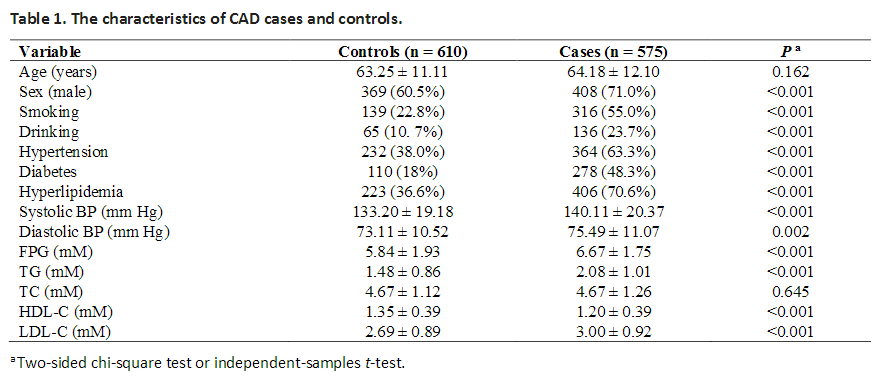 表1列出了CAD组和对照组的基本特征,在年龄方面,病例组和对照组之间没有显著的统计学差异。与对照组相比,CAD患者的男性、吸烟者和饮酒者的比例更高。此外,CAD组的空腹血糖、收缩压和舒张压的临床数据显着高于对照组。在脂质谱比较中,CAD患者的TG和LDL-C显着高于对照组,而血清HDL-C显着低于对照组。CAD患者比对照组更容易患糖尿病、高血压和血脂异常。总之,这些数据进一步表明,男性、吸烟、饮酒、高血压、糖尿病和高脂血症是中国汉族人群发生冠心病的重要危险因素。