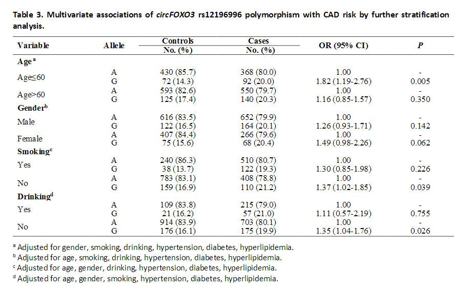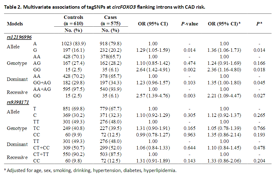 2 circFOXO3多态性与CAD风险的多变量关联