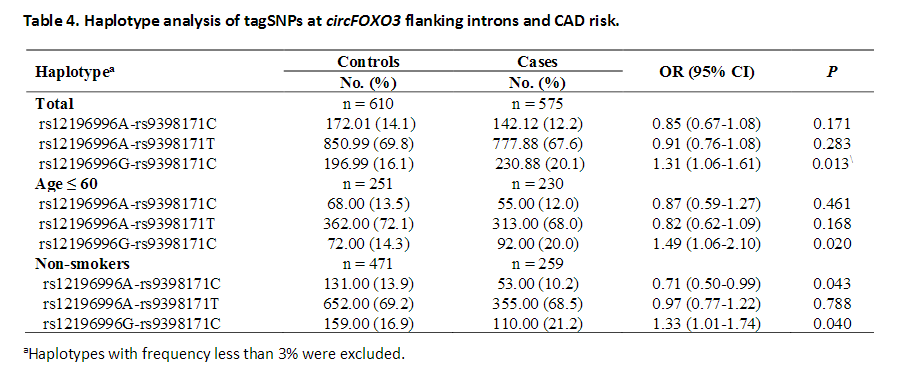 4 circFOXO3多态性与CAD风险的单倍型分析