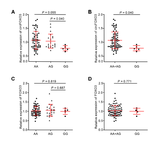 为了进一步研究circFOXO3 rs12196996多态性的功能相关性,作者利用实时定量RT-PCR技术对rs12196996基因型与circFOXO3和线性FOXO3的表达水平进行相关性分析。circFOXO3的PCR产物直接进行测序,证实了外显子3反向剪接的存在。如图2A所示,在携带GG基因型的受试者中,circFOXO3的表达水平比具有AA或AG基因型的受试者更低。从总体上看,与组合的AA + AG基因型相比,GG基因型与较低水平的circFOXO3之间存在显着关联(P = 0.040,图2B)。然而,rs12196996与线性FOXO3的表达水平之间并没有显着联系(图2C和2D)。