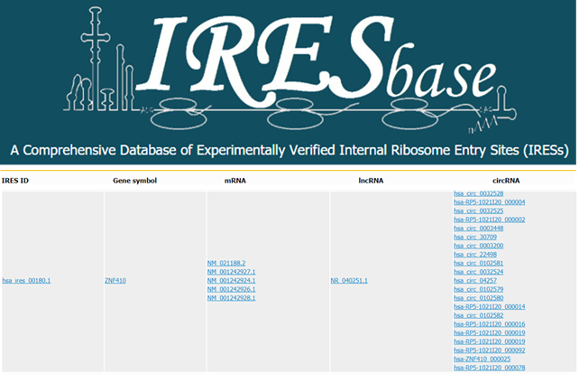 在已证实的 circRNA 中,有一个 circZNF609,我们都知道辛脂蛋白家族非常庞大,据统计有越 700~900 个基因都能编码辛脂蛋白。我非常好奇是否还包含其他辛脂蛋白基因编码的 circRNA 也包含 IRES。通过 IRESbase 搜索 ZNF,我发现除了 ZNF609 还包含许多其他辛脂蛋白基因,并且每个基因能够编码的包含 IRES 的 circRNA 数量非常巨大,例如 ZNF410