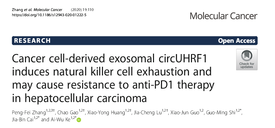2020年6月27日,复旦大学附属中山医院的施国明、蔡加彬和柯爱武为共通讯作者在Molecular Cancer(IF=15.302)杂志上发表了一篇题为“Cancer cell-derived exosomal circUHRF1 induces natural killer cell exhaustion and may cause resistance to anti-PD1 therapy in hepatocellular carcinoma”的文章,阐述由肝癌细胞分泌的外泌体circUHRF1,可以通过miR-449c-5p/TIM-3途径,来抑制NK细胞功能、促进肝癌的免疫逃逸和提高抗PD1免疫疗法的耐药性,并为肝癌患者提供一种新的治疗策略,即靶向circUHRF1([1])。
