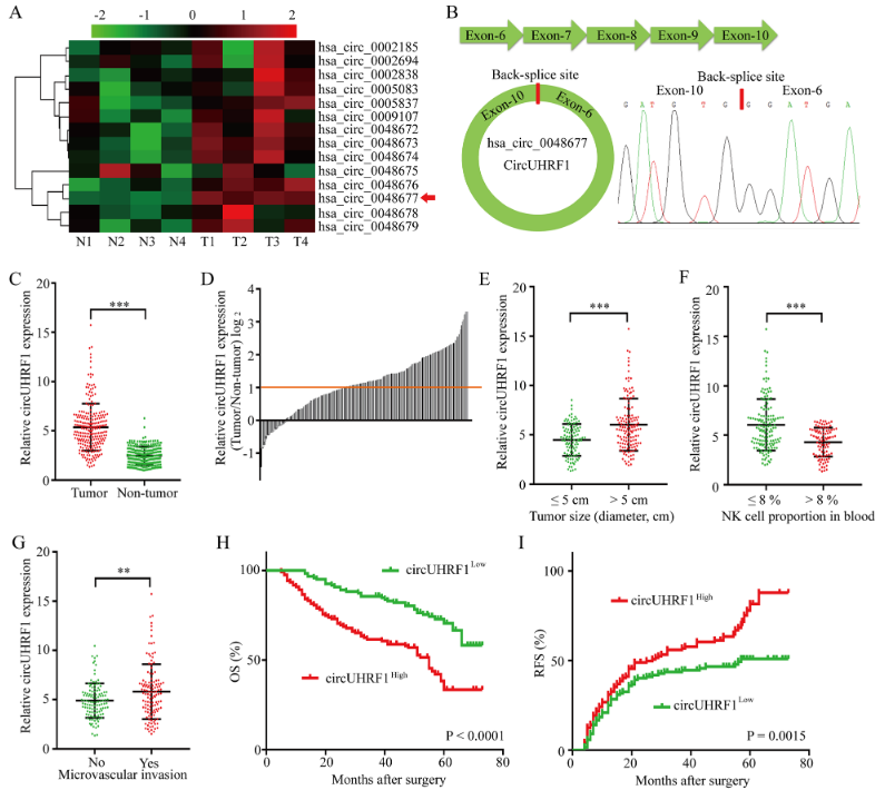 在肝癌的发生发展中,UHRF1经常被上调,并在其病理过程中起关键作用。circRNA是由前体mRNA(pre-mRNA)反向剪接生成的单链闭合环状RNA,越来越多的研究表明,circRNA参与调控肝癌在内的多种癌症的发生发展,因此,作者想要探索UHRF1来源的circRNA是否也在肝癌的进展中起到重要作用。作者用qRT-PCR 技术检测UHRF1来源的14个circRNA在肝癌组织和配对癌旁组织中的表达水平。其中,hsa_cic_0048677(circUHRF1)是表达量最高的环状RNA,并在肝癌组织中上调。随后,作者检测了240例肝癌组织和配对癌旁组织中circUHRF1的表达差异,肝癌组织中circUHRF1的表达明显高于癌旁组织。接下来作者选取circUHRF1作为研究对象,探讨240例肝癌患者的circUHRF1表达与其临床病理特征之间的关系,与circUHRF1低表达患者相比,circUHRF1高表达患者的肿瘤体积较大,血液中NK细胞比例较低,微血管浸润较多。此外,还分析了肝癌患者的circUHRF1表达对临床预后的预测作用。Kaplan-Meier生存分析表明,circUHRF1高表达患者伴随临床预后不良。多因素分析表明,circUHRF1可以作为总生存期(OS)和术后复发的独立预测分子。综上所述,circUHRF1,在肝癌细胞中上调,并与患者的预后不良相关,它可能在肝癌的发生发展中起重要作用。