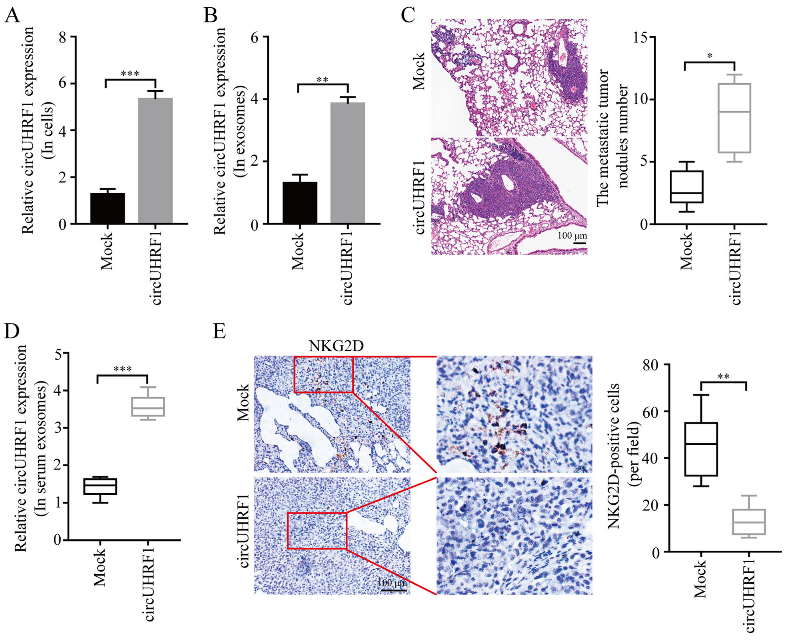 为了进一步挖掘circUHRF1在肝癌中的作用,作者使用pLO5-ciR-circUHRF1慢病毒载体来上调PLC / PRF / 5细胞中circUHRF1的表达,过表达效率已被qRT-PCR证实。在过表达circUHRF1的HCC细胞中,外泌体circUHRF1水平也显著上调。接下来,作者使用PLC/PRF/5细胞构建肺转移的NOD/SCID小鼠模型(注射来自健康供者的NK细胞)。结果表明,在接种过表达circUHRF1细胞的肺转移小鼠内,血浆外泌体中circUHRF1水平更高,肺部的转移瘤结节更多及结节内NKG2D阳性细胞更少。这些结果表明,circUHRF1以外泌体和NK细胞依赖性的方式促进HCC进展。