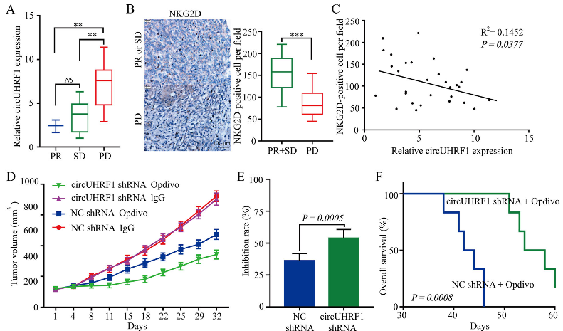 然后,作者测量circUHRF1的表达水平,结果表明,PD组的circUHRF1水平明显高于SD组和PR组。为了进一步探讨circUHRF1与免疫逃避之间的关系,作者检测了30例HCC患者组织中NKG2D的表达水平。结果表明,与抗PD1治疗敏感的HCC患者相比,抗PD1治疗耐药的HCC患者中NKG2D的阳性细胞数明显减少。散点图分析显示,HCC组织中circUHRF1表达与NKG2D的阳性细胞数呈负相关。为了直接评估circUHRF1对抗PD1治疗的影响,作者通过皮下植入circUHRF1基因敲低的HCCLM3细胞或相应的阴性对照细胞来构建小鼠移植瘤模型。结果表明,植入circUHRF1基因敲低细胞的小鼠对抗PD1治疗敏感,并伴随总生存率的提高。综上所述,过表达circUHRF1可以提高HCC对抗PD1治疗的耐药性,而靶向circUHRF1可能是恢复HCC对PD1治疗敏感性的有效方法。