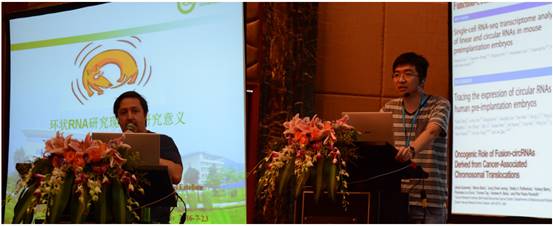 首场报告由中科院广州生物医药与健康研究院资深研究员Miguel Esteban教授和鲍习琛博士开始,题目为《环状RNA研究现状及意义》。Miguel教授和鲍习琛博士系统回顾了RNA研究的历史进程,对环状RNA以及非编码RNA的研究历史,主要作用机制及未来可能的研究方向等问题做了高屋建瓴,深入浅出的报告。