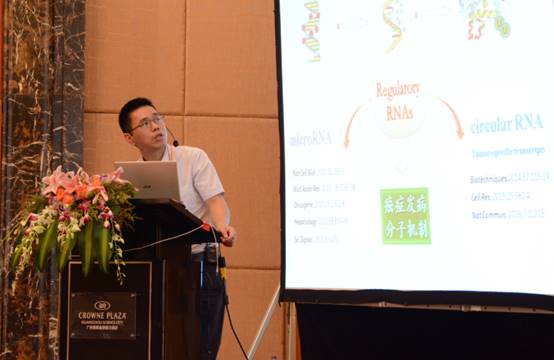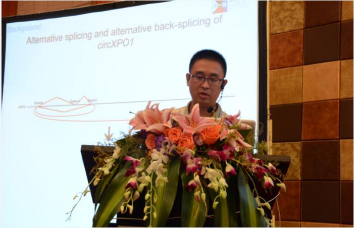 下午第一场由来自中国科学技术大学单革教授实验室的博士后陈亮博士做了题为《Exon-Intron circular RNAs regulate transcription》的报告,主要介绍了他们如何发现并揭示携带内含子的一类特殊的环状RNA(EIciRNA)如何调控基因转录作用的重要研究成果,陈亮博士的报告为参会代表研究环状RNA打开了新的研究方向。
