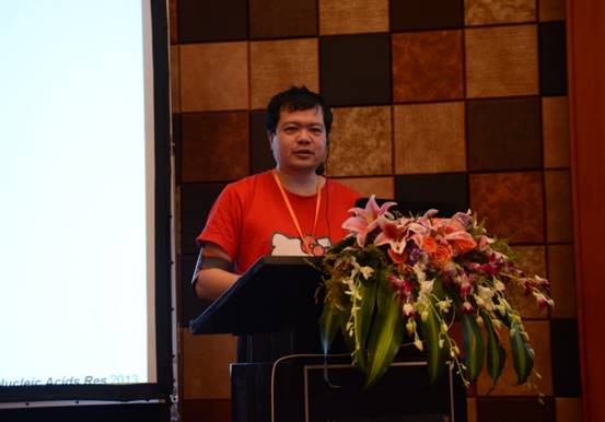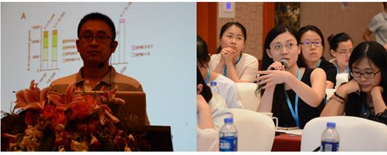 接下来,暨南大学的张弓教授做了题为《翻译组学-RNA组学研究的新天地》的精彩报告。张教授演讲热情洋溢,妙语连珠。张教授除了介绍翻译组学最新进展,还着重介绍了基于其独创的RNC-seq技术揭示了细胞翻译组学的重要特征,并通过此技术预测和验证了部分非编码RNA编码蛋白的现象,也暗示环状RNA也存在编码蛋白或多肽的可能。报告结束后与会人员进行了热烈的讨论。