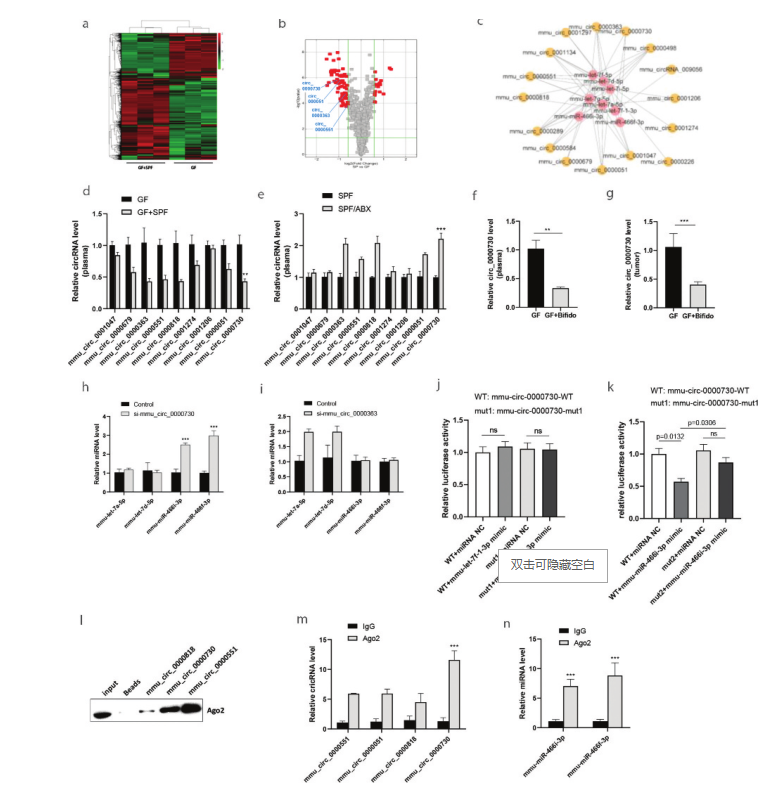 背景:越来越多的证据表明,肠道菌群在癌症进展中起着重要作用。但是,基本机制仍然未知。该研究报道了广谱抗生素(ABX)治疗通过改变肠道微生物组组成导致转移增强。研究结果表明:经过ABX处理的SPF小鼠表现出肺转移能力增强。从SPF小鼠或双歧杆菌到无菌细菌的粪便微生物菌群移植(FMT)显著抑制了肺转移。从机制上讲,肠道菌群会影响circRNA表达,从而调节相应miRNA的水平。具体而言,肠道微生物群的这种调节以IL-11依赖性方式抑制mmu_circ_0000730表达。生物信息学与荧光素酶报告基因分析相结合,揭示了mmu_circ_0000730和mmu-miR-466i-3p之间的相互抑制。mmu-miR-466i-3p和mmu-miR-466 f-3p均抑制许多与上皮间质转化(EMT)和癌症干细胞(例如SOX9)有关的基因。这些结果提供了以前未认识到的非编码RNA在微生物群介导的癌症转移中的调节作用的证据,提示,微生物组可作为潜在治疗靶标。