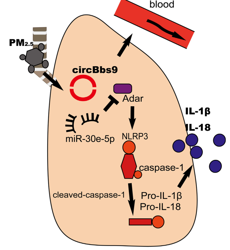 图注:circBbs9通过激活NLRP3炎症小体促进PM(2.5)诱导的小鼠肺部炎症机制示意图。